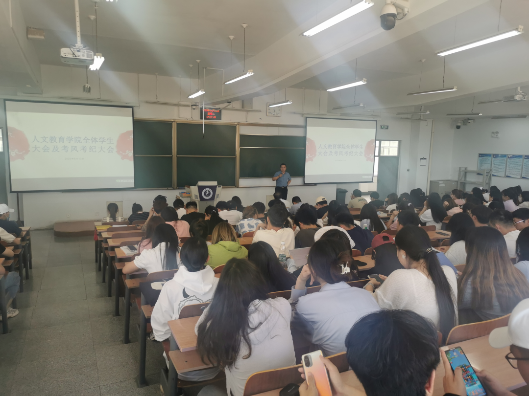 人文教育学院组织召开全体学生大会暨考风考纪大会2023-06-13为确保全国大学英语四六级考试以及本学期期末考试顺利进行,加强学生的诚信考试意识,规范考试行为,6月13日,人文教育学院在金山校区北楼103教室组织召开了学生大会暨考风考纪大会。 会上... -