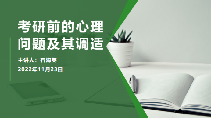在两个小时的讲座中,石海英老师从考研常见的心理问题、考研心态调试方法和减压小窍门三部分出发,结合自己工作中的丰富案例,引导同学们在备考冲刺阶段保持积极乐观的心态,经常进行自我激励,尊重情绪规律,保证充足的睡眠,养成良好的运动习惯,合理饮食等,并为大家分享了放松训练、自我暗示和饮食减压等小窍门。