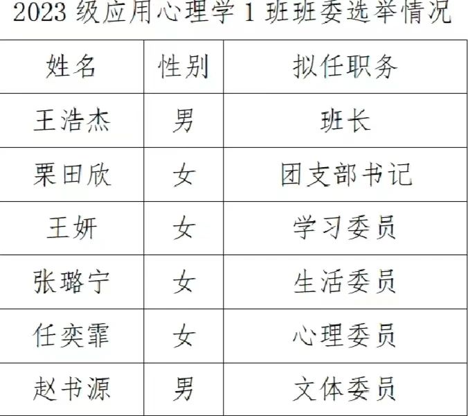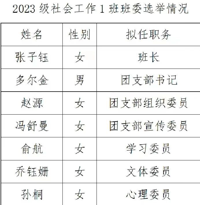 同时,为做好班级日常管理工作,提高班级管理工作效率,本着为同学服务的原则,2023级应用心理学一班和2023级社会工作一班分别选举了班级委员会成员。经过提交申请书、竞选演讲、民主投票等环节的综合考评,班干部当选人员名单如下: