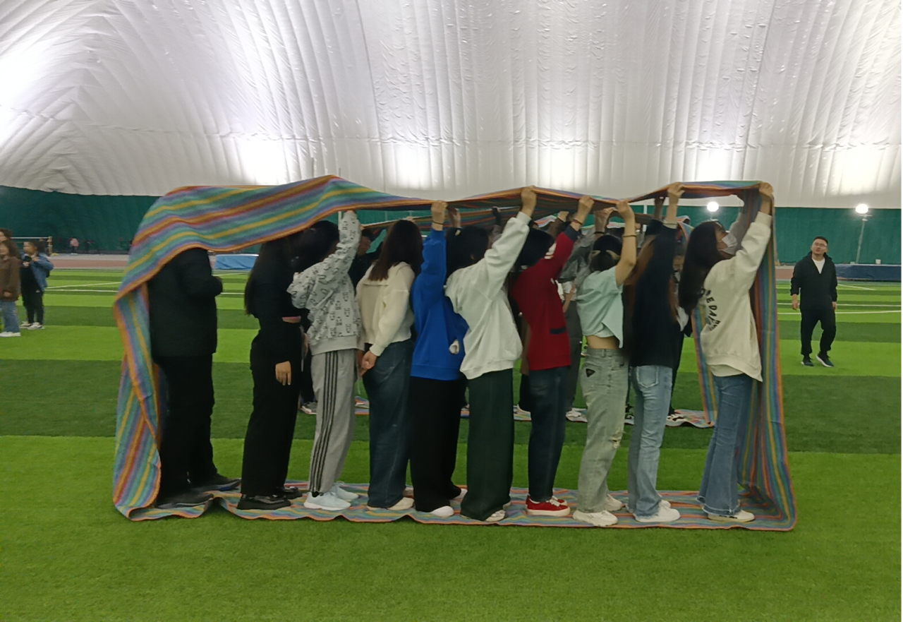 每组8~10人,从传送布袋里从起点走向终点,大家彼此支持,一起努力,培养组织计划与协调能力,增强相互信任和理解。