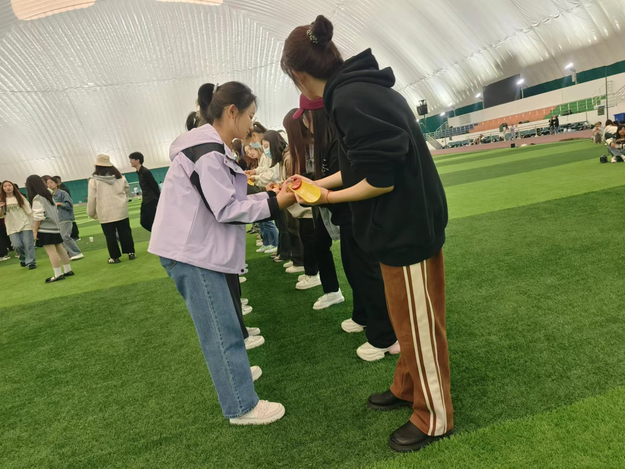 大家站成一排,手握半圆弧桶,心拧为一股绳,怀着共同的期望,在一传一递中感受团队协作的重要性。