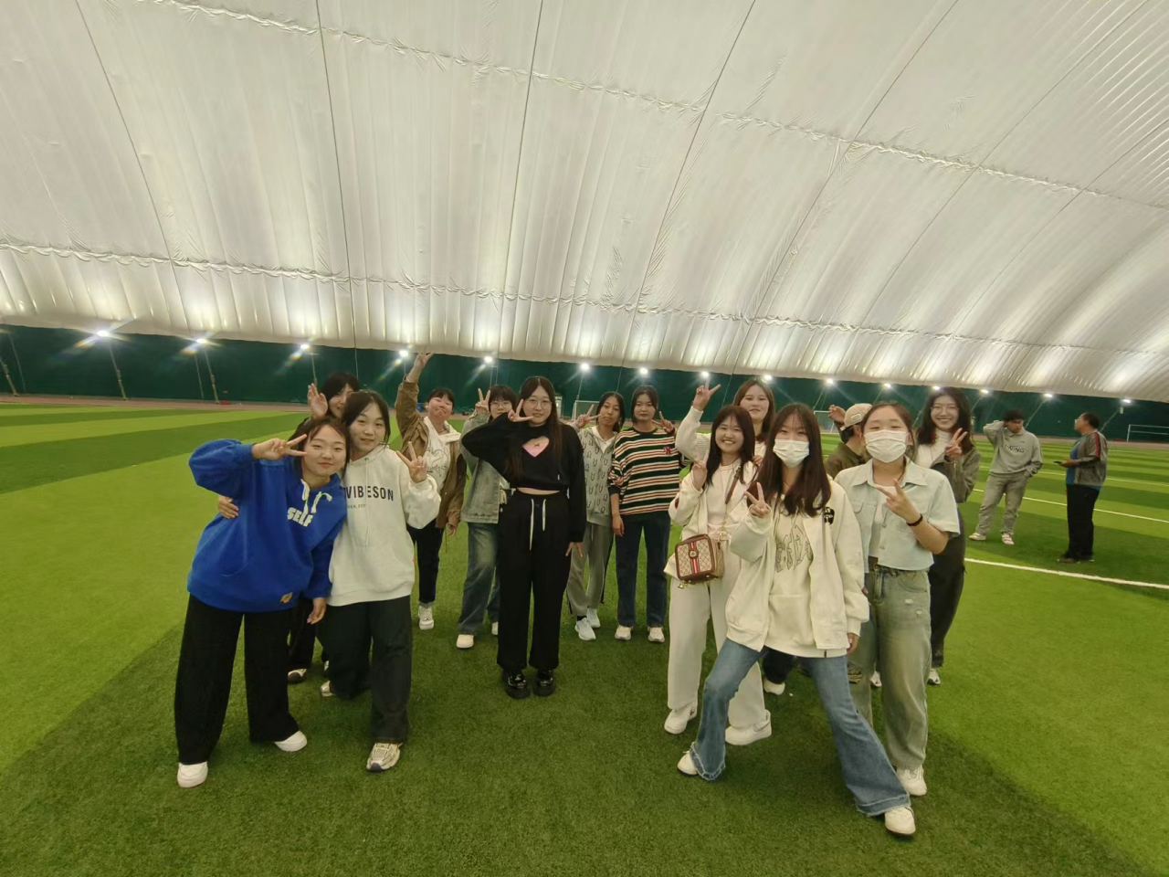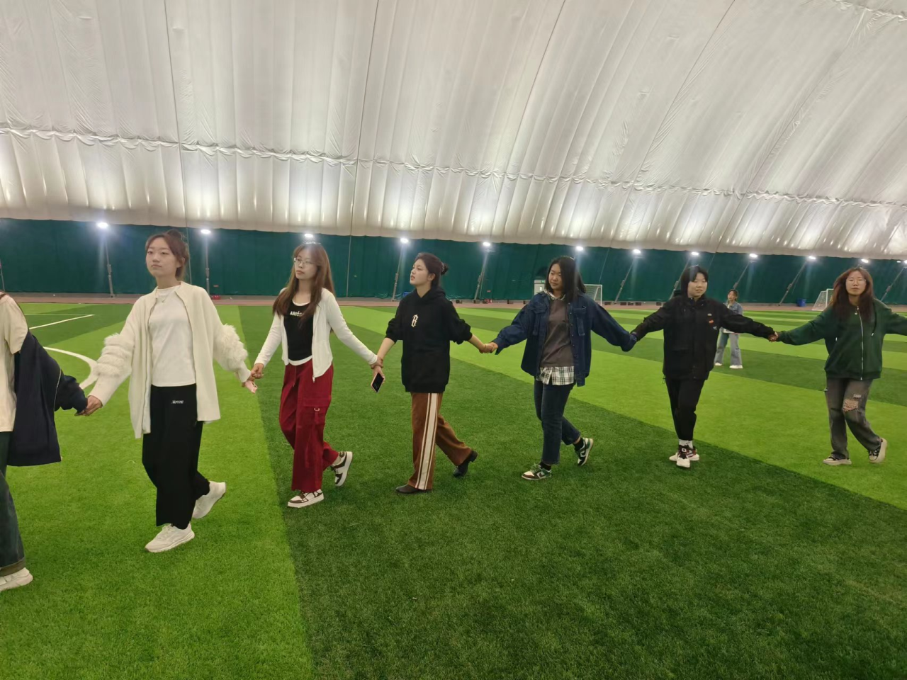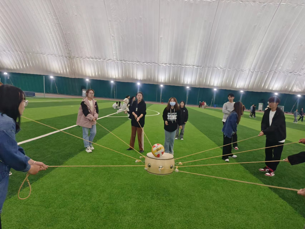 每组8~10人,相互配合,行动一致,让小球稳稳落在鼓上,同学们在一次次尝试中总结经验,进一步增强了班级凝聚力。