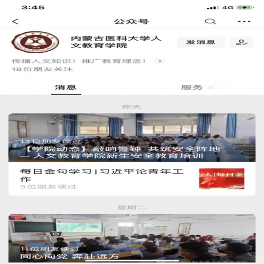 在学生生活与发展层面,学院采取多种方式提升服务质量与水平,为人才培养提供有力支持。一方面,学院积极开展新生入学教育,举办“以心迎新 以心动心”系列活动,全院教师积极参与迎新工作;开学首日,学院领导深入学生及家长中,及时回应家长关切,解答疑难困惑;设立“迎新志愿者服务队”和“一对一迎新志愿者”接待新生;举办新生素质拓展活动和形式多样的入学讲座,帮助新生更好的融入大学生活。另一方面,学院与时俱进,拓展思政工作渠道,开通了“人文教育学院”微信公众号及抖音官方账号,通过制作学生们喜闻乐见的短视频,解答学习及生活困惑,收到了良好的育人效果,实现了思想政治工作传统优势同信息技术深度融合发展。此外,学院在微信公众号上开设了心理健康咨询信箱,收集学生咨询信息,定期开展心理辅导,推进学校心理健康教育,促进学生身心健康成长。