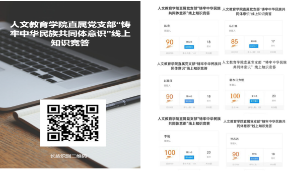 为大力推进以爱国主义为核心的民族团结进步教育,铸牢中华民族共同体意识,加强各民族师生交往交流交融,有形有感有效抓实做细青年铸牢中华民族共同体意识教育各项工作,以实际行动迎接党的二十大胜利召开,近日,人文教育学院开展了“铸牢中华民族共同体意识”知识竞答活动。