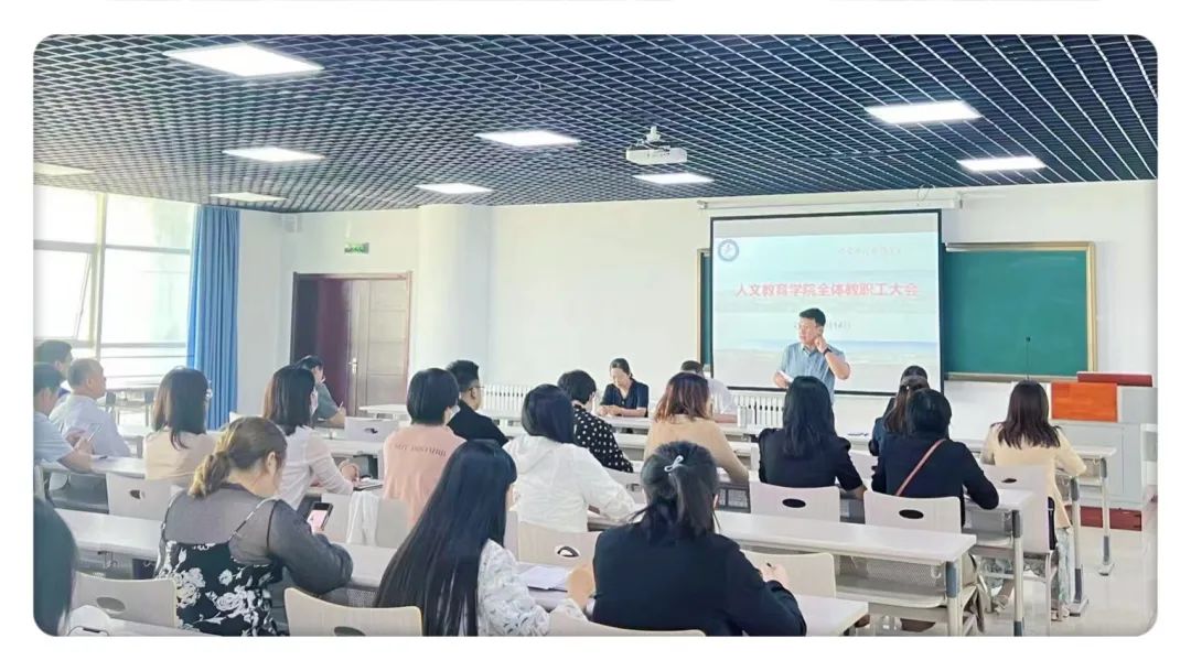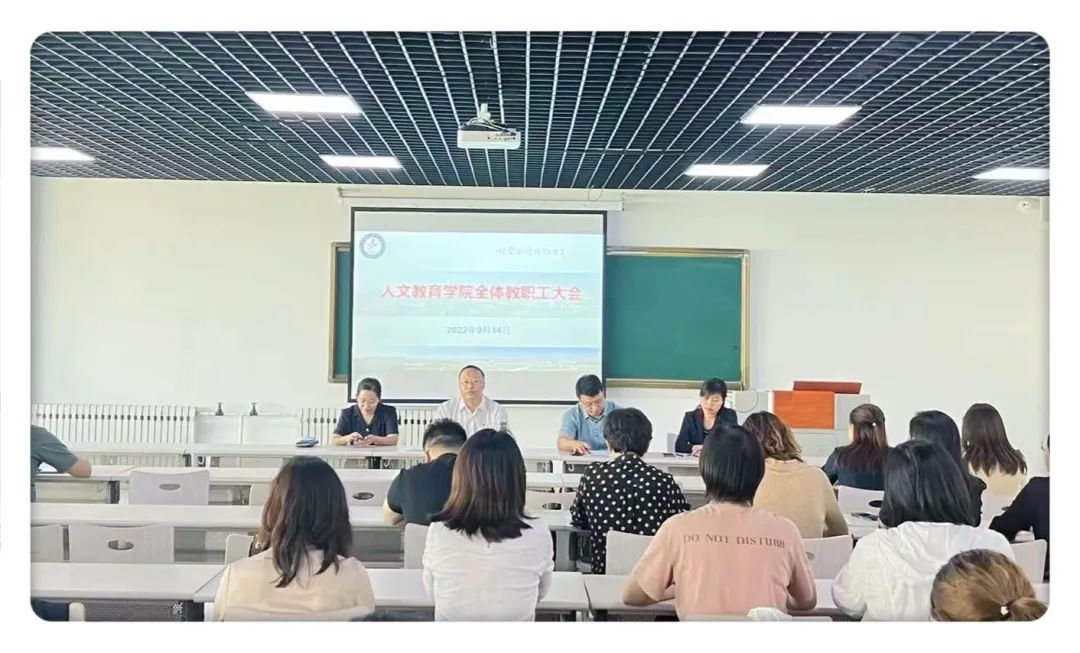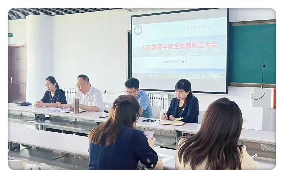 9月14日上午,人文教育学院在文体馆四楼多媒体会议室召开了全体教职工大会。学院党总支书记孙利军,院长温国政,副书记、副院长石海英,副院长姜玉霞及全体教职工参加会议。会议由温国政主持。