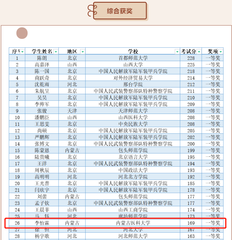 日前,由北京市人文知识竞赛组委会承办的2022年华北五省(市、自治区)大学生人文知识竞赛总决赛圆满落幕,经官网公示,我校第二附属医院2021级康复治疗学专业1班的李怡霖同学在本次总决赛中获得一等奖。本次获奖也是我校首次获得华北五省(市、自治区)大学生人文知识竞赛总决赛一等奖,开创了内蒙古医科大学学生在此项赛事中的最好成绩。