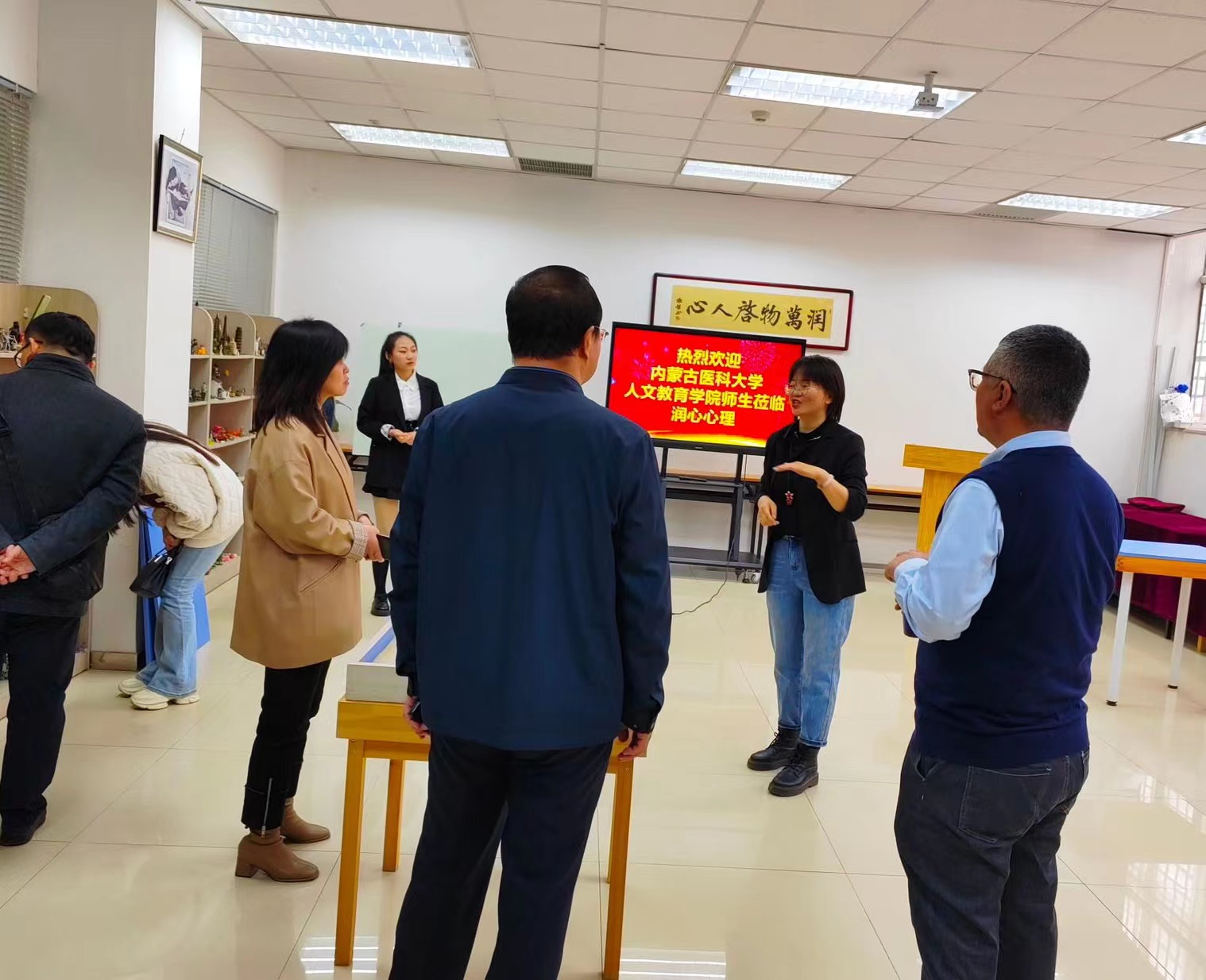 内蒙古润泽教育咨询有限责任公司“润心心理”创始人周明及团队成员热情迎接了到访的师生。润心心理”团队成员董俊霞老师向我们一一介绍了润心心理的品牌理念、企业16年的发展历程,业务板块,发展战略,企业使命。在整个过程中人文教育学院师生们深刻感受到了心理学面向市场和社会广泛的应用,以及当前和未来应用心理学职业发展的的新方向,更让专业学生们感受到了应用心理学职业发展的前途与希望。之后,董俊霞老师带领师生们参观了沙盘治疗室、咨询室、沙龙室、多功能室以及别具一格的教室。董老师还分享了自己的“专业-职业-事业”之心路历程,她的成长经历激励和感染着每一位学生,让大家对未来的专业之路充满信心和美好的期待。