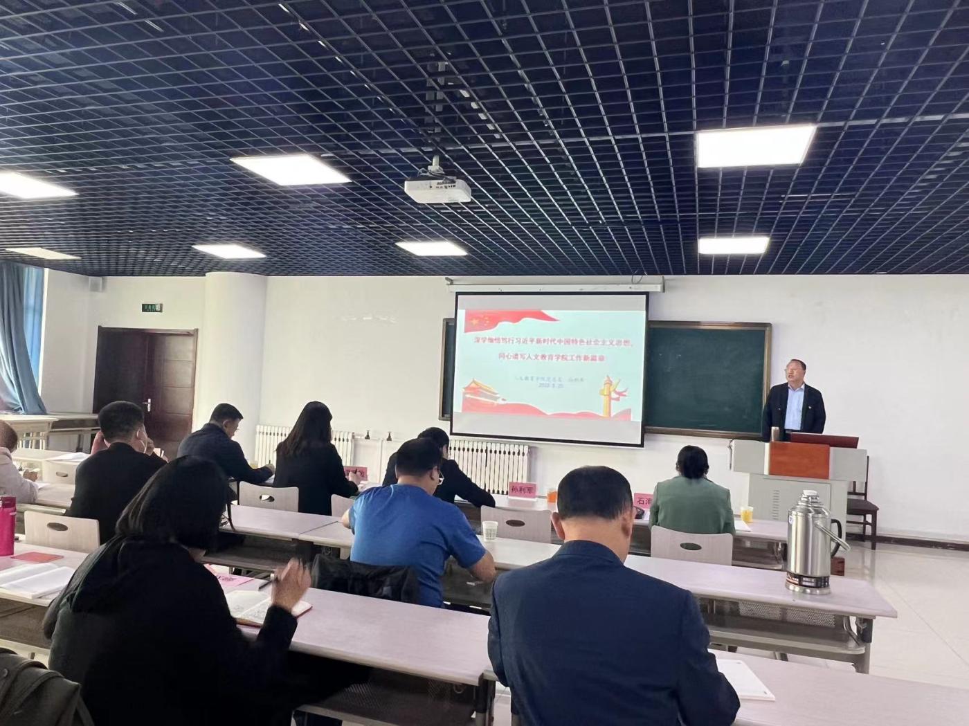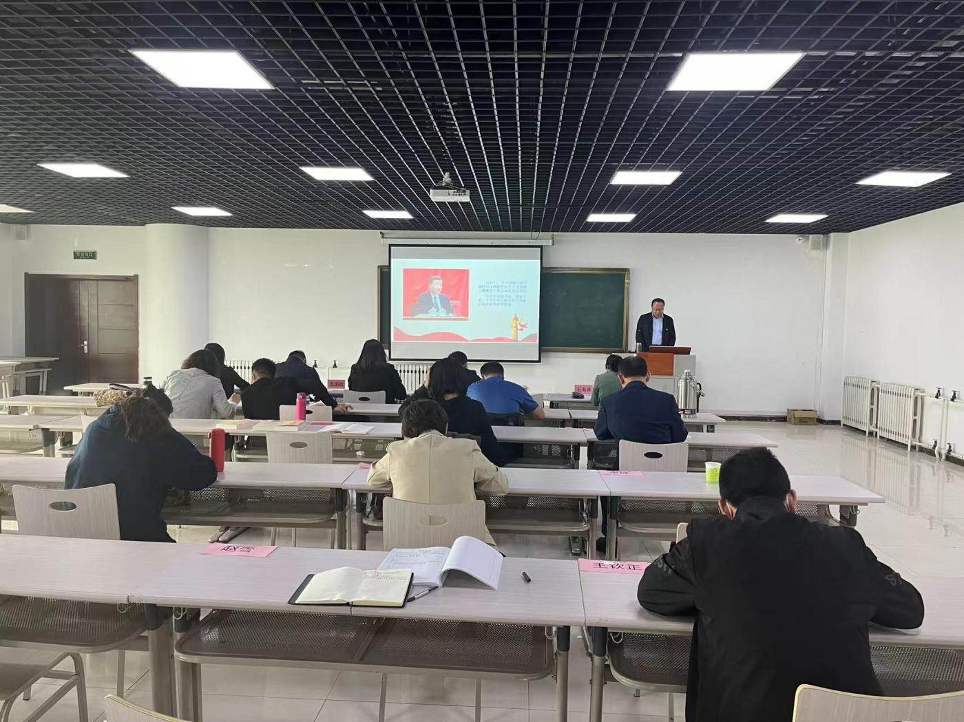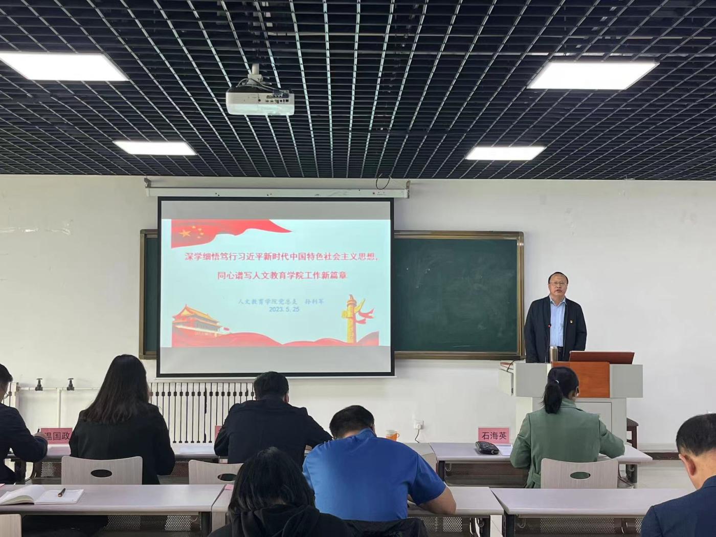 按照学习贯彻习近平新时代中国特色社会主义思想主题教育相关部署,5月25日上午,人文教育学院党总支书记孙利军以《深学细悟笃行习近平新时代中国特色社会主义思想,同心谱写人文教育学院工作新篇章》为题在文体馆四楼多媒体会议室为学院全体党员讲授了一堂生动的主题教育专题党课。学校党委主题教育第四督导组组长于国辉、成员温晓敏列场指导。学院领导班子成员及全体党员参加了党课学习。