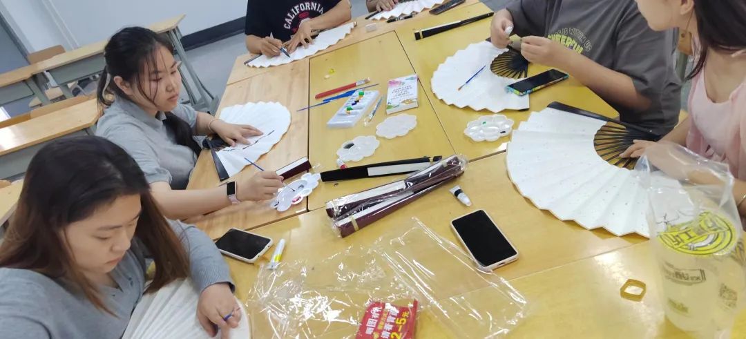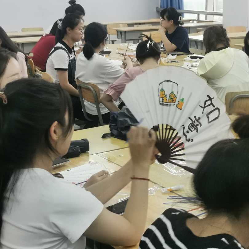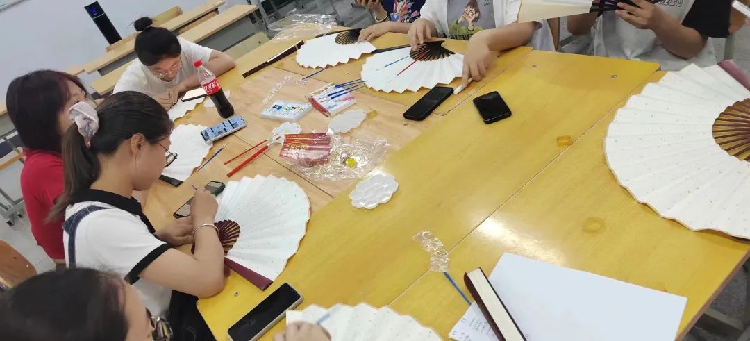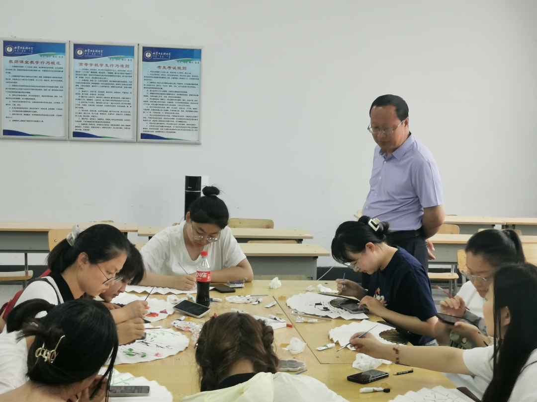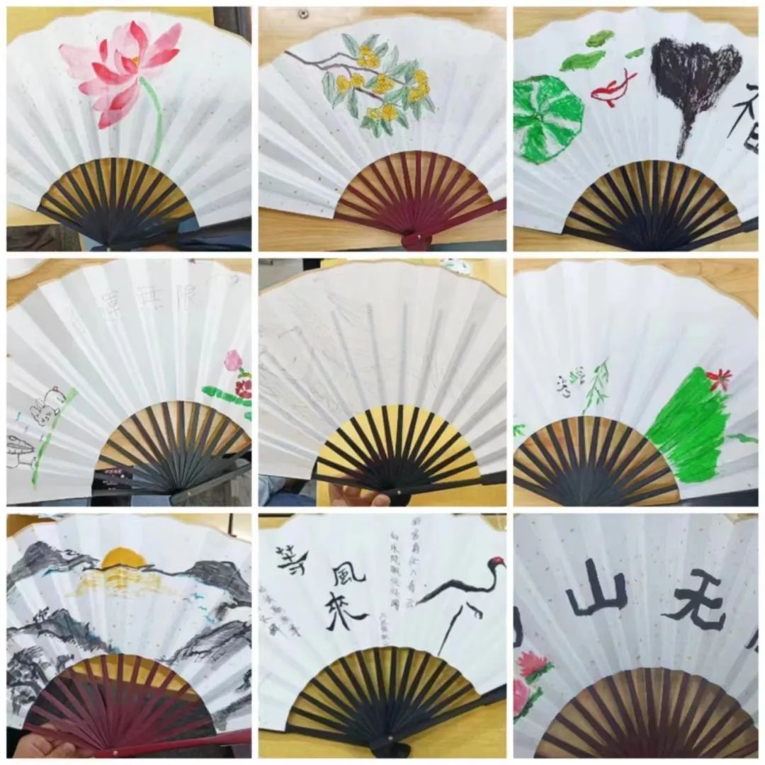 在我国古代,特别是宫廷贵族的文化中,有端午节送扇子的传统习俗,这是一个已经具有一千三百多年历史的儒家文化传统,包含着“庶动清风,以增美德”的美好寓意。同学们奇思妙想,将自己对中华优秀传统文化的热爱呈现在小小的扇面上,一幅幅栩栩如生的纸扇画就这样脱颖而出了。有的同学还邀请孙书记帮忙提字,现场气氛和谐融洽。