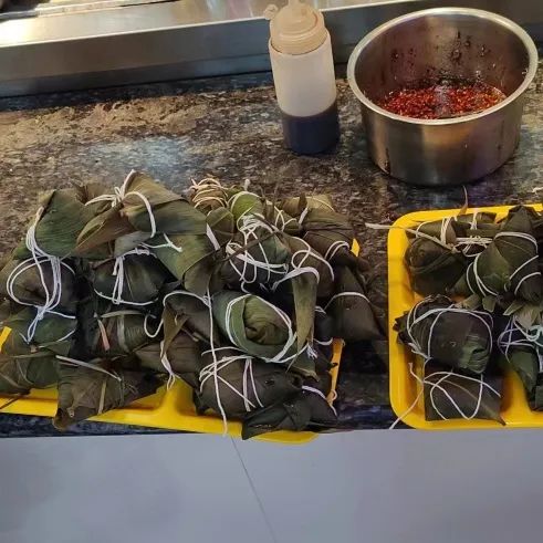 端午节吃粽子是我国的传统习俗。粽子,又叫做“角黍”“筒粽”。其由来已久,花样繁多。同学们提前准备好了剪刀、棉线以及泡好的红枣、蜜枣、糯米、黑米等。折粽叶、填糯米、放枣、裹粽子、扎线……一道道工序有条不紊地进行着,在老师的指导下,大家一遍遍地学习和尝试,忙得不亦乐乎,功夫不负有心人,一个个可爱的小粽子就这样诞生啦。