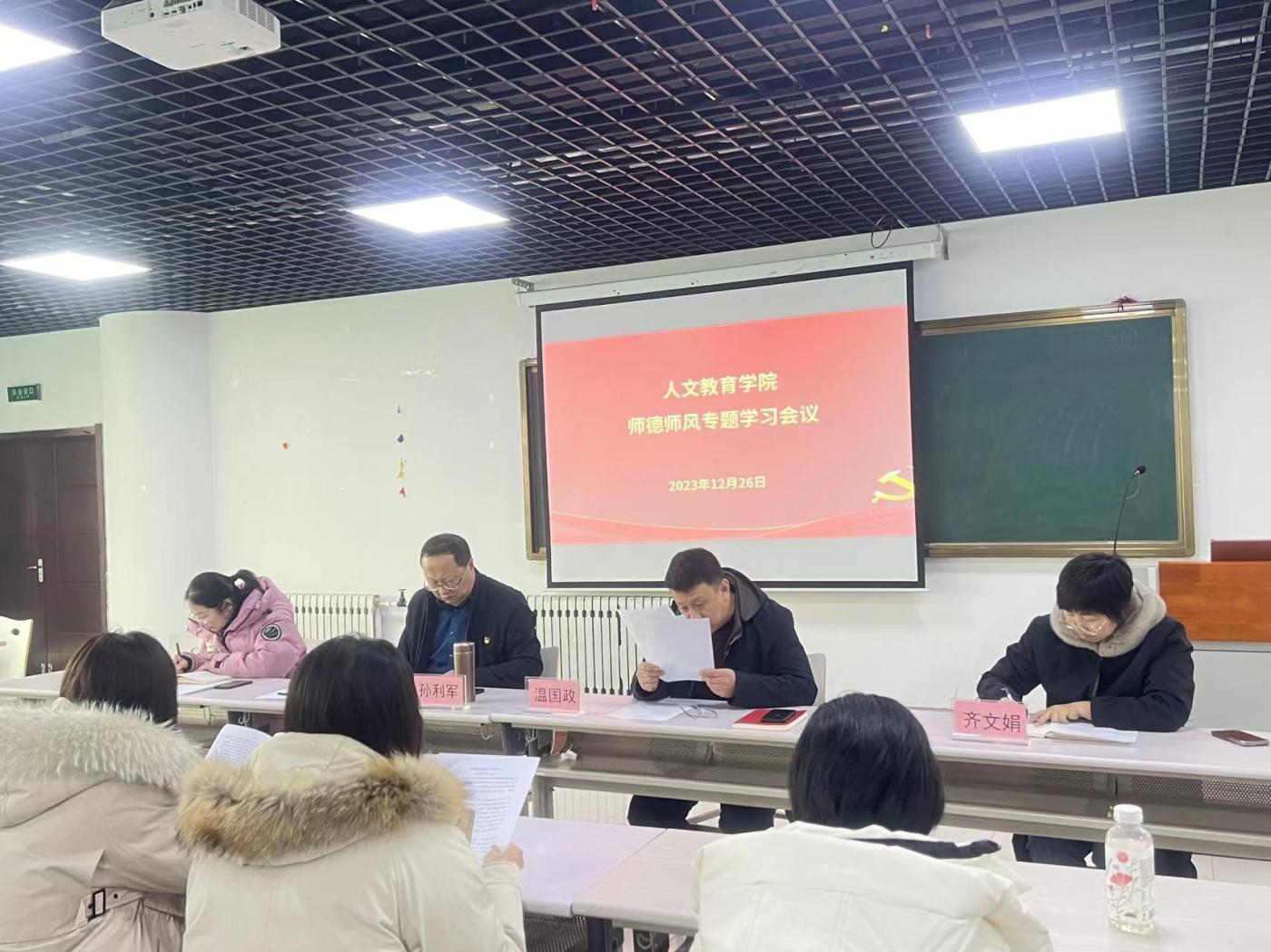 为深入贯彻落实《关于加强和改进新时代师德师风建设的意见》精神,进一步加强和改进学院师德师风建设,激励引导广大教师争做“四有”好老师,当好“四个引路人”,坚守“四个相统一”,12月26日下午,人文教育学院在文体馆四楼多媒体会议室开展了师德师风专题学习会议,会议由院长温国政主持,学院全体教职工参加了会议。